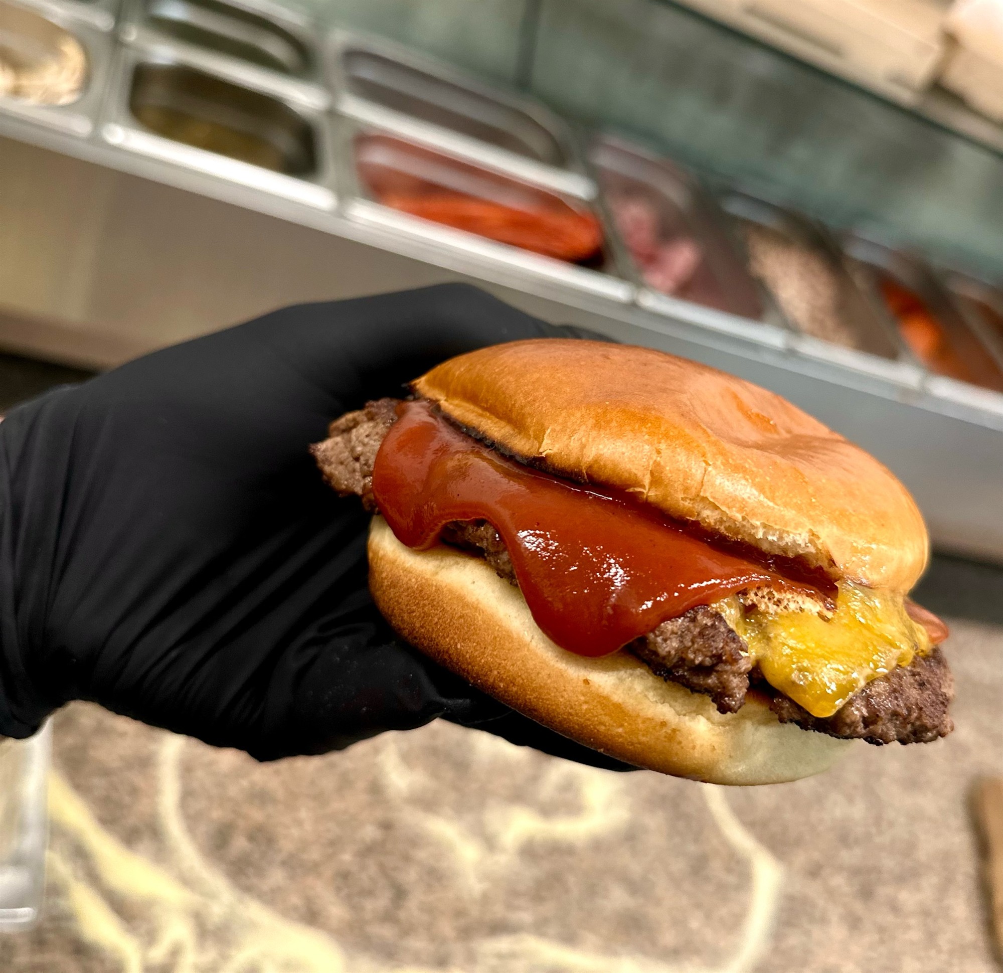 Brioche bolli, búffur 175gr., ostur, ketchup, kips & djús