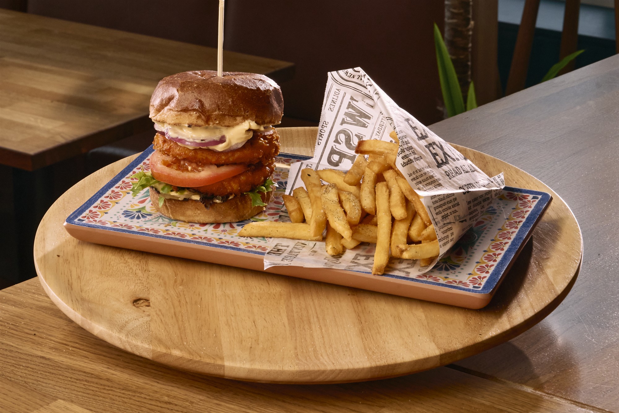 Brioche bolli, broyskin høsnarungabúffur, salatmix, tomat, reyðleykur & Tasty dressingur