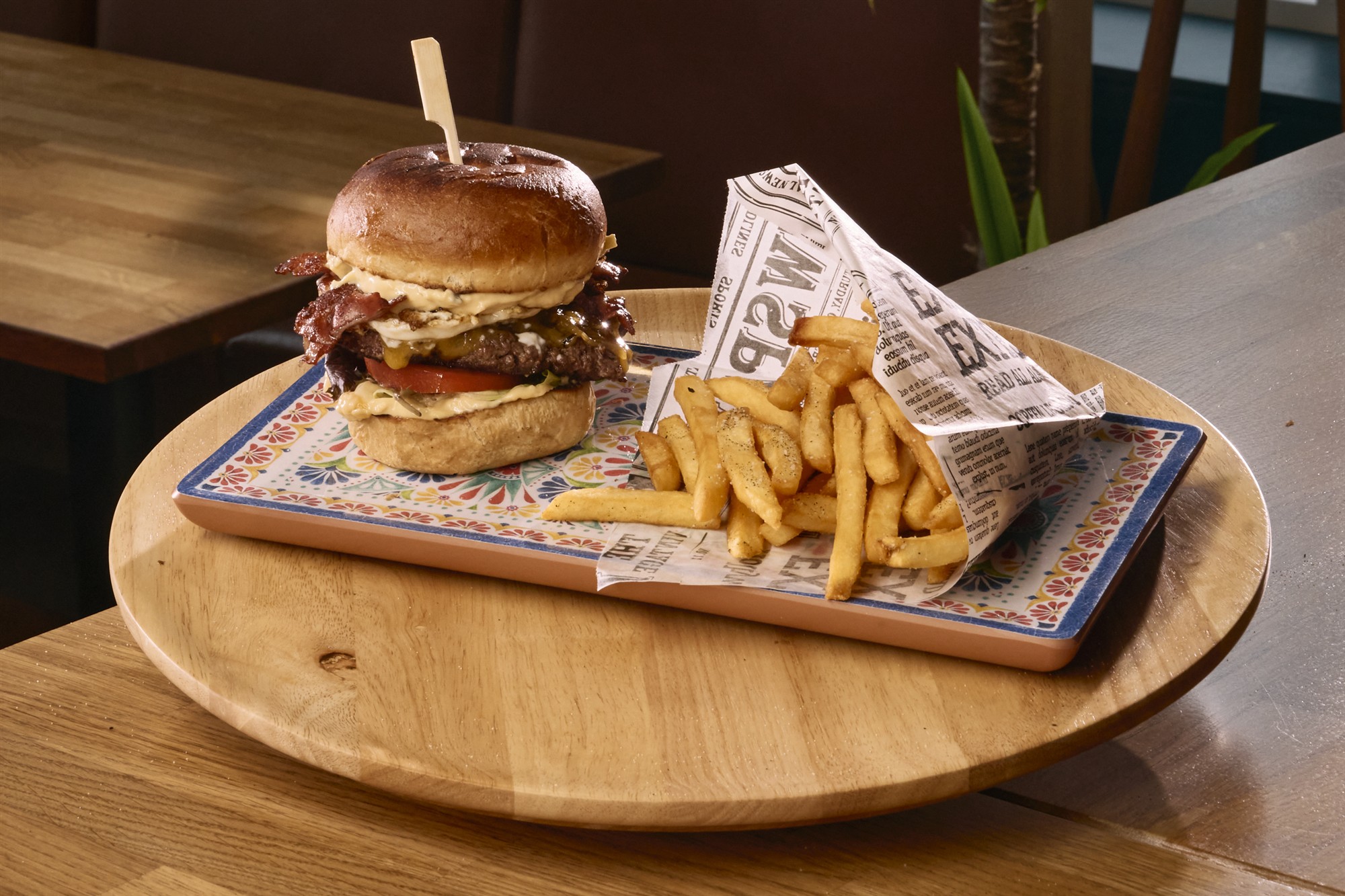 Brioche bolli, 200gr búffur av góðum malnum kjøti, egg, bacon, salatmix