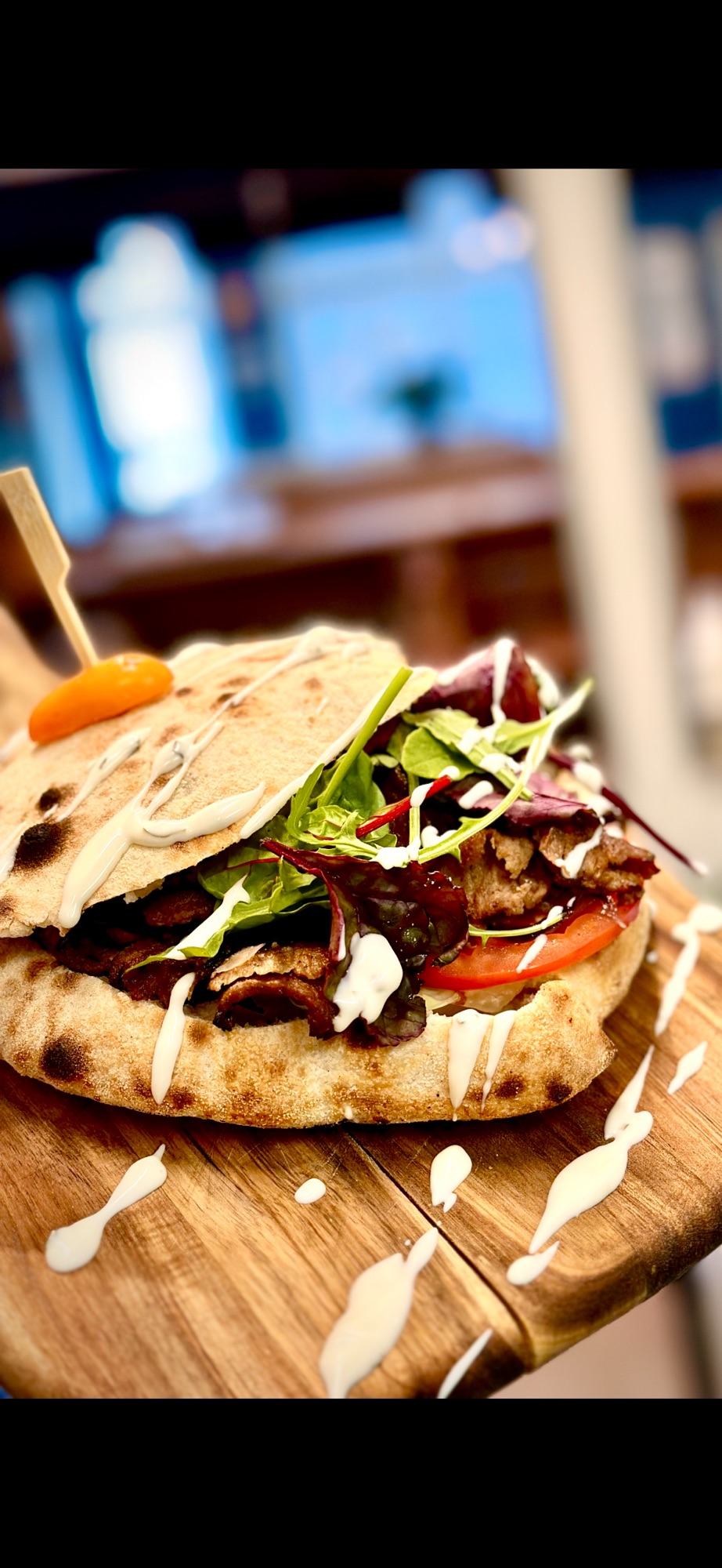 Heimamarineraður høsnarungi/shawarma, heimagjørt pitabreyð, salatmix, tomat, reyðleykur & valfrí dressing