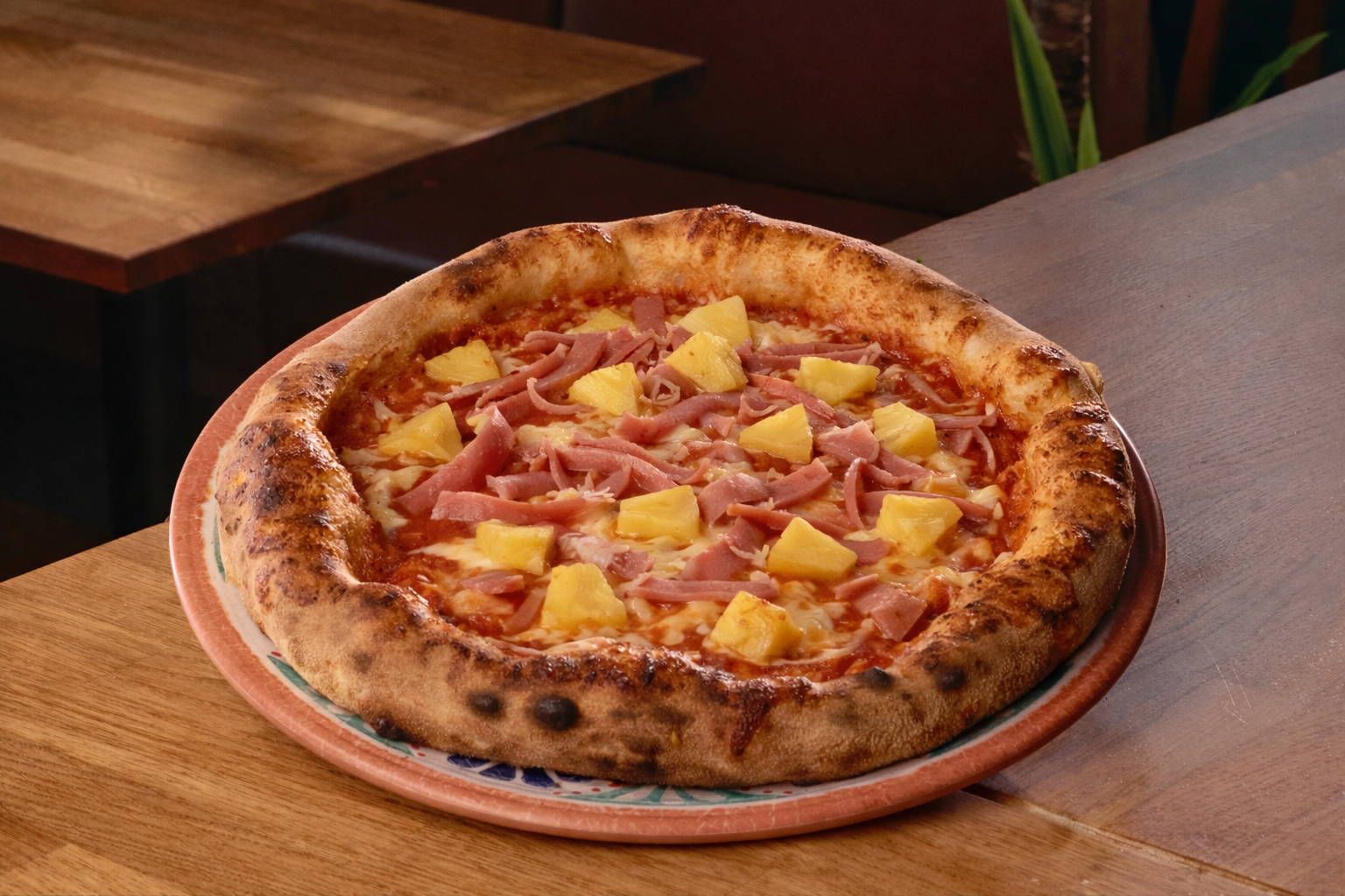 Tomatsós, rivin mozzarella ostur, skinka, ananas