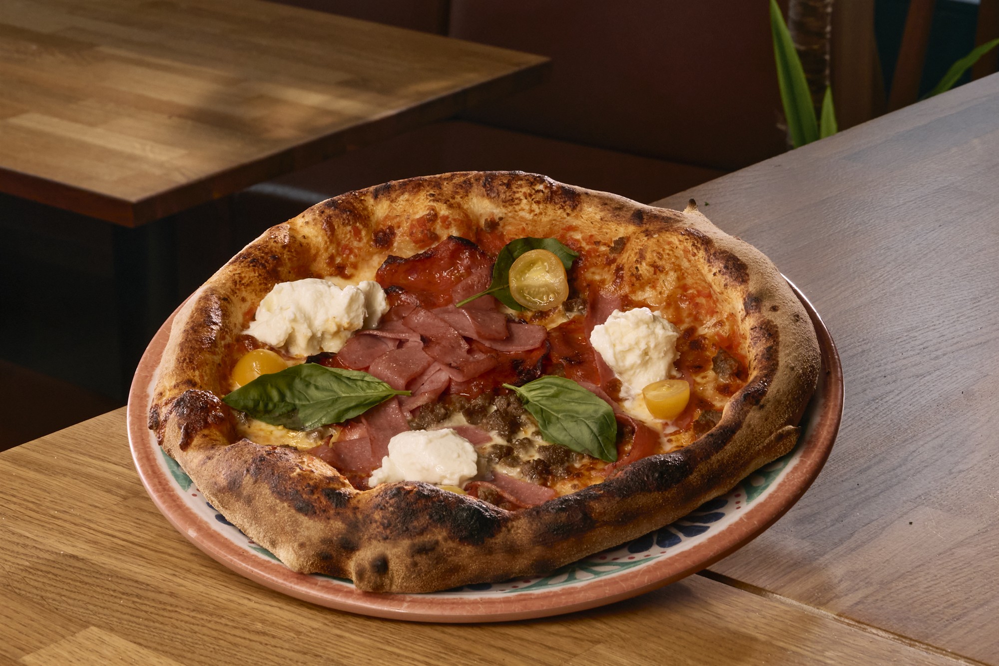 Tomatsós, rivin mozzarella ostur, skinka, chorizo, neytakjøt